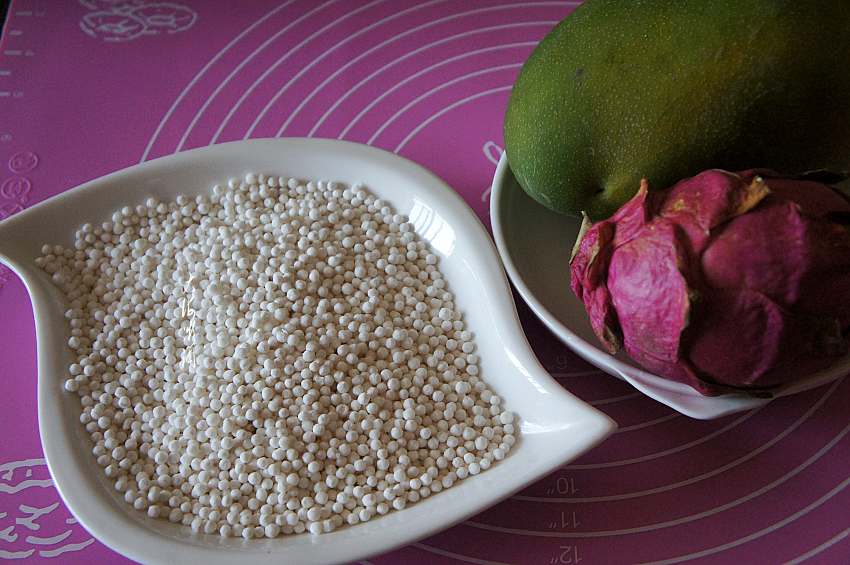 【西米水果月饼】所需食材:西米150g;玉米淀粉适量;白糖适量;芒果半个;红心火龙果少许。