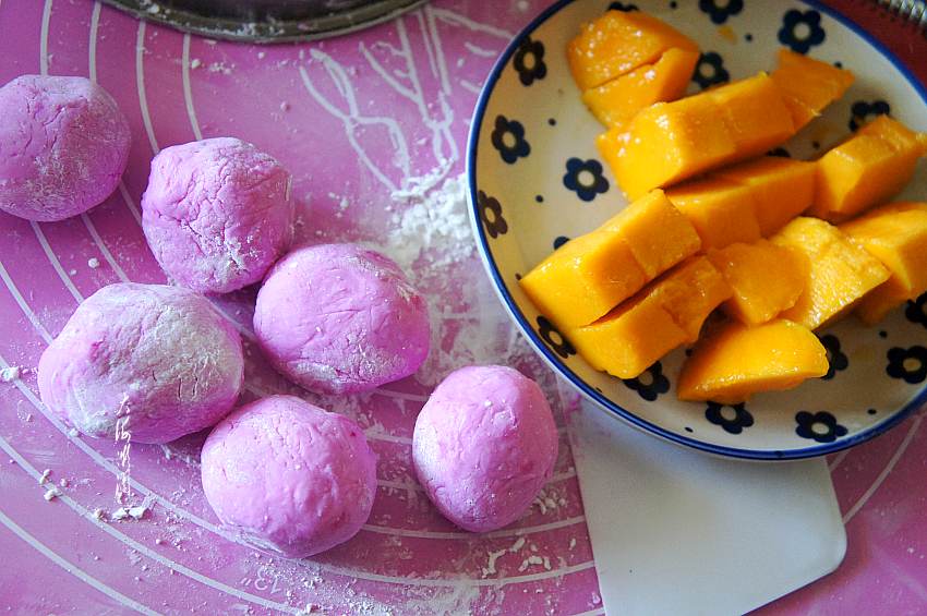7、芒果去皮切块,模具是50g的,芒果块不能太大,否则压制成型的过程容易压坏。西米面团均匀的分成40g一个的面剂子。