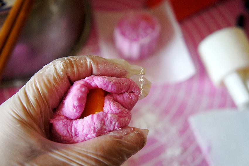 8、将油纸裁成小块,一块油纸能放下一块月饼即可,取一个面团压扁慢慢用手推薄,包入备好的芒果肉,虎口慢慢向上推移,使面皮均匀的包裹住馅料,收口搓圆,不能有缝隙,放入模具挤压成型。