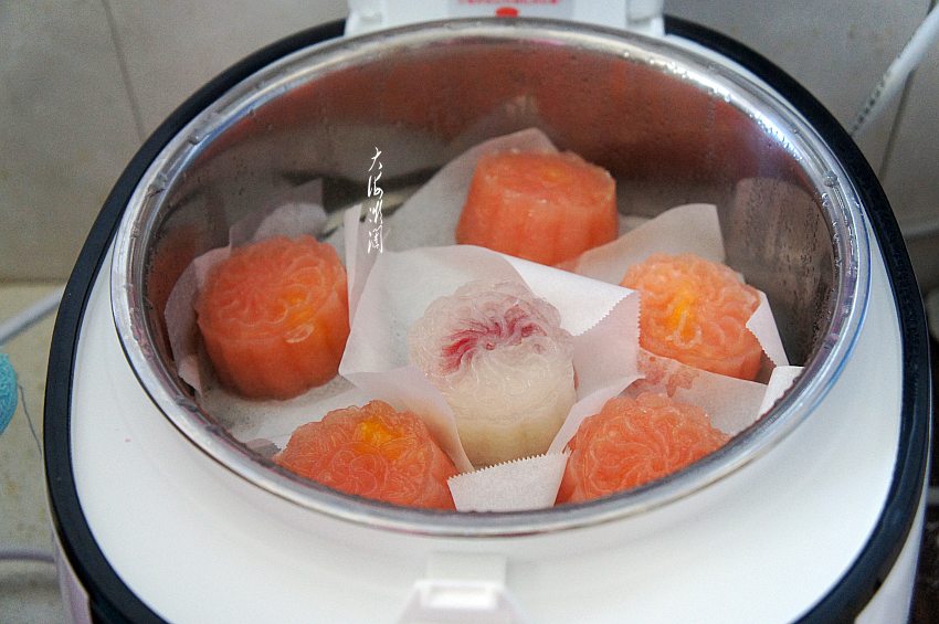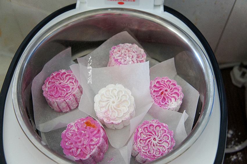 10、这款月饼是需要蒸熟的,因为西米我们用的是生粉,什么蒸锅都可以,将做好的月饼码入电饭煲。
