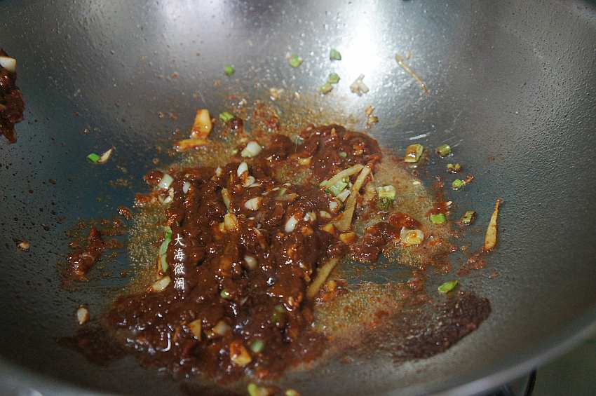6、做火锅底料:葱、姜、蒜去皮洗净切段儿、切片、切末,炒锅加入适量的油,爆香葱、姜、蒜,加入火锅底料,炒出香辣味。