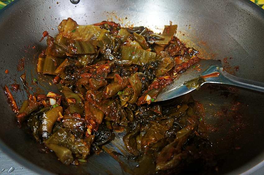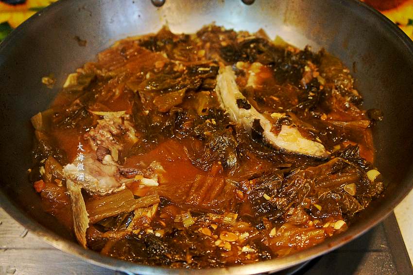 7、买的老坛鱼酸菜去除,反复清洗干净,切段,下入锅中煸炒,煸炒出酸香味,再加入适量的水。鱼火锅加了酸菜起到解腻、解辣还去腥的作用,吃肉吃腻了吃一口酸菜特开胃。感觉特别辣的时候吃一口酸菜瞬间被缓解,而且煮鱼锅不醒,味道还特别鲜美。