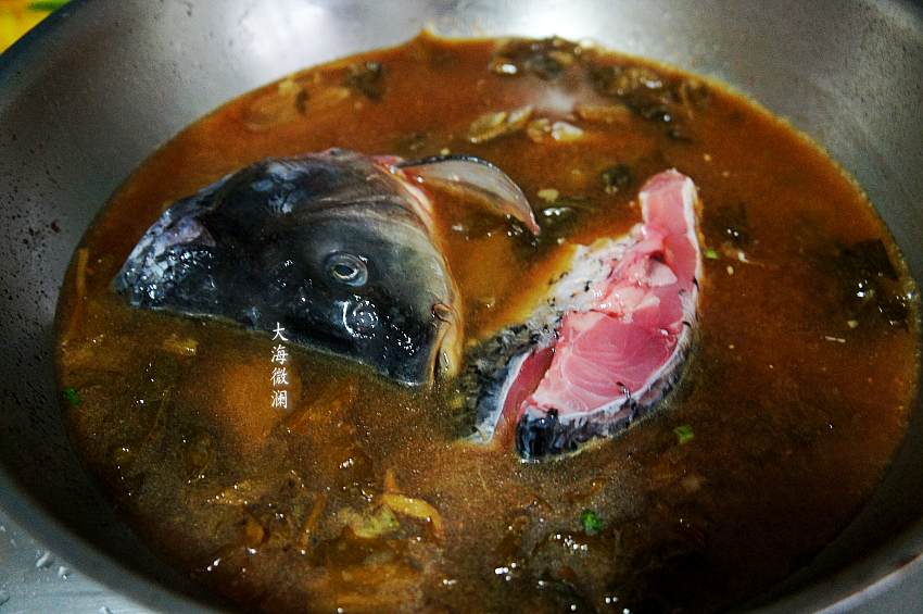 8、加入数量的水,加入鱼头和鱼骨,大火烧开。