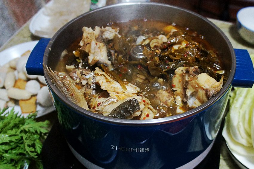 9、大火烧开2分钟后关火,这时锅底料就做好了,鱼头和鱼骨也煮的差不多了,其中一半倒入火锅中,另一半倒入盆中,随时添加,端上桌启动火锅开关就可以开餐了。