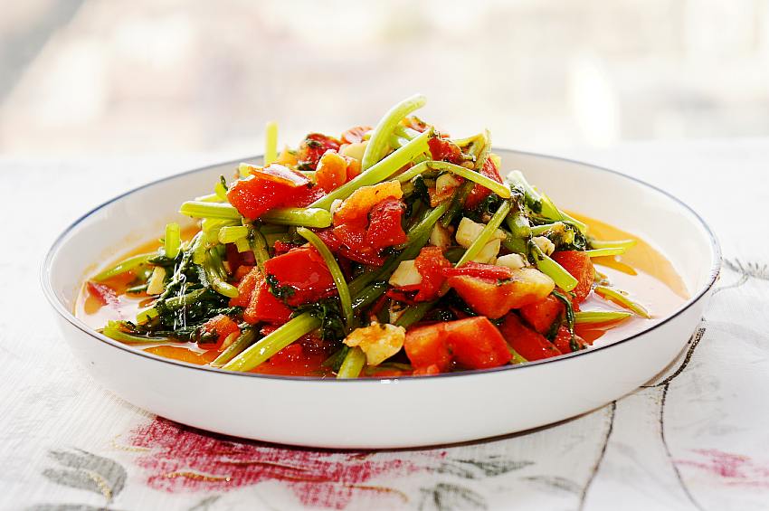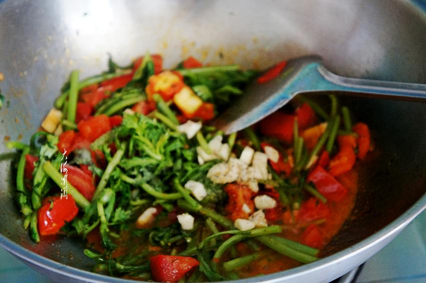 【西红柿炒茼蒿】所需食材:茼蒿1把;西红柿1个;大蒜适量;油适量;盐适量;胡椒粉适量;生抽少许。