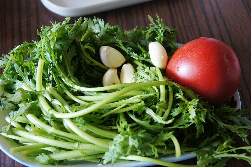 做法及步骤:1、一把茼蒿去掉老叶,在淡盐水中浸泡10分钟左右,反复清洗干净,同样的方法清洗西红柿,大蒜去皮洗净备用。