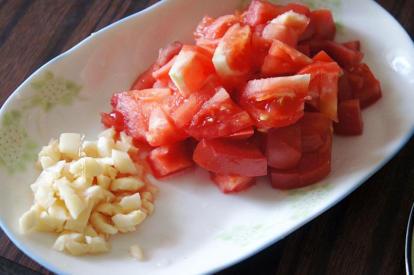 3、清洗干净的西红柿切丁,便于炒出汤汁。大蒜拍碎,再切几刀,不要太碎。