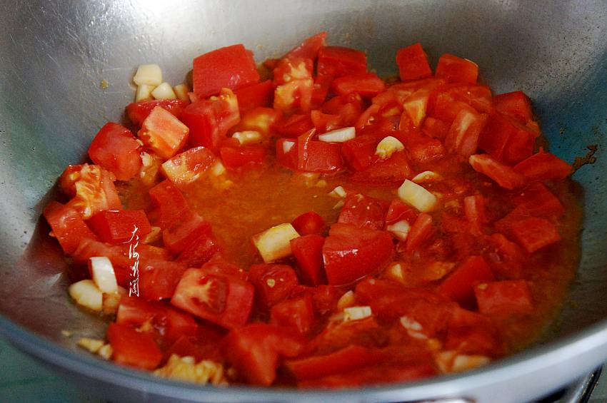 4、炒锅加入适量的油,爆香蒜碎,留一半蒜碎出锅用,加入西红柿丁翻炒。