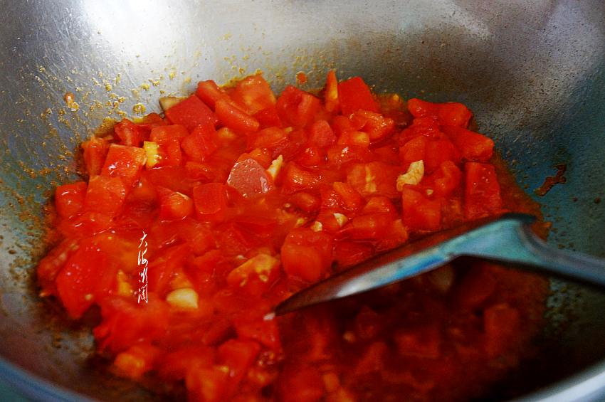 1、这道菜记得西红柿一定要炒出汤汁,味道才浓郁。西红柿切丁,更容易炒出浓郁的汤汁。