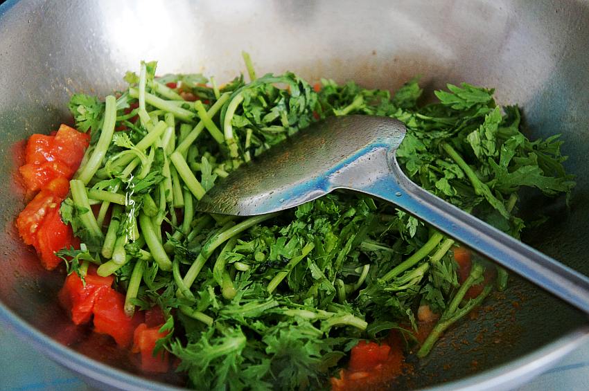 2、茼蒿要大火快速翻炒,几下就好,别炒过了,否则口感不好。