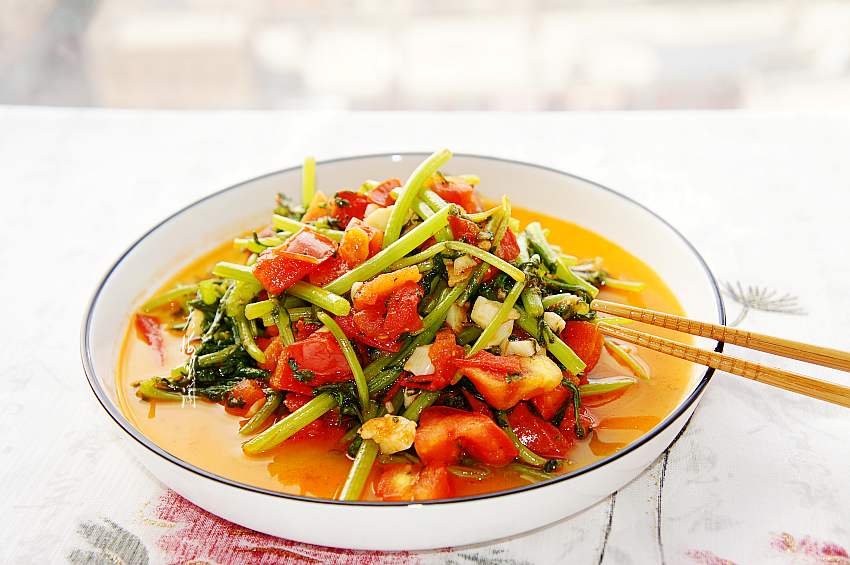 一道简单又美味的家常菜,西红柿炒茼蒿,酸甜爽口,开胃下饭,老人孩子都爱吃,特别适合干燥的秋天。西红柿也叫番茄,是日常家庭生活中常备的一种食材,可生津止渴,清热解毒。深受大众喜爱,尤其是小朋友特别喜欢西红柿酸酸甜甜的味道。西红柿自身的酸甜比用调料调制出来的味道更加自然、顺口,所以我家常备西红柿,无论生食还是配菜都是不可多得好食材。而且营养价值非常高,被称为“神奇的菜中之果”。与茼蒿搭配,不但颜色漂亮,酸甜可口,营养更加丰富。古代茼蒿为宫廷佳肴,所以又叫皇帝菜,有蒿之清气、菊之甘香。含有人体所必须的氨基酸和多种营养素,西红柿和茼蒿二者都含有大量的膳食纤维,能加快肠胃蠕动,促进消化,并减少胃肠道对食物中脂肪的吸收,促进身体内的毒素排出,有润肠通便的作用。经常食用不但助消化,还能润泽肌肤,有一定的瘦身作用。