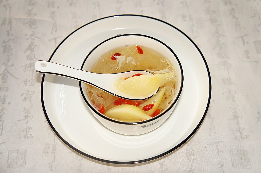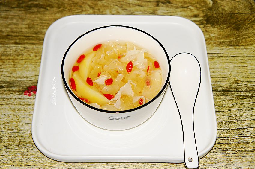 【银耳雪梨汤】所需食材:银耳1把;雪梨1个;冰糖适量;枸杞子适量。