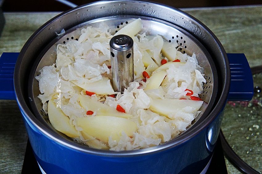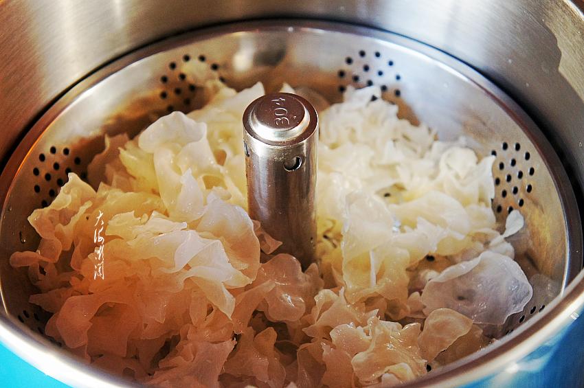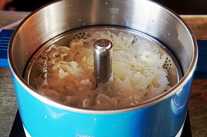 3、将银耳放入锅中,这些天用惯了这个臻米智能升降电火锅,不只用来吃火锅,煮羹煮汤特方便,操作简单,大火小火好控制,不外溢,用得顺手,不像砂锅煮时要盯着,怕外溢,这锅1到5档,定好火力尽可以放心煮。