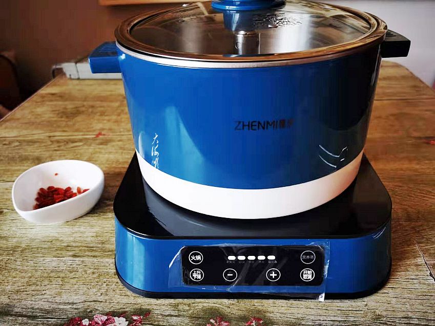9、枸杞子洗净,关火前下入锅中煮1分钟关火。一键提起提篮,所有食物都在蓝中,是不是很方便。