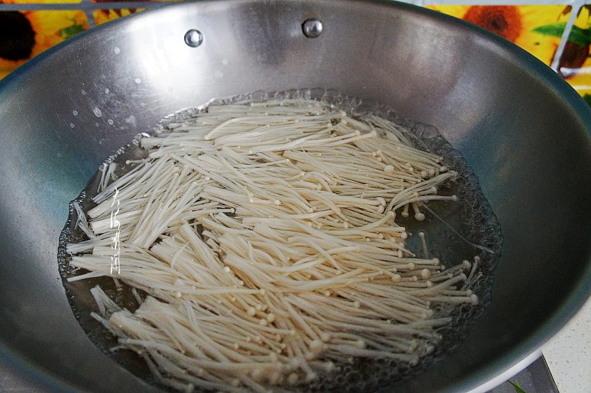 2、准备馅料:金针菇切掉根部,淡盐水中浸泡10分钟,流水反复清洗干净。锅中加入适量的水烧开,过水焯金针菇,捞出过冷水,攥掉水分切碎。
