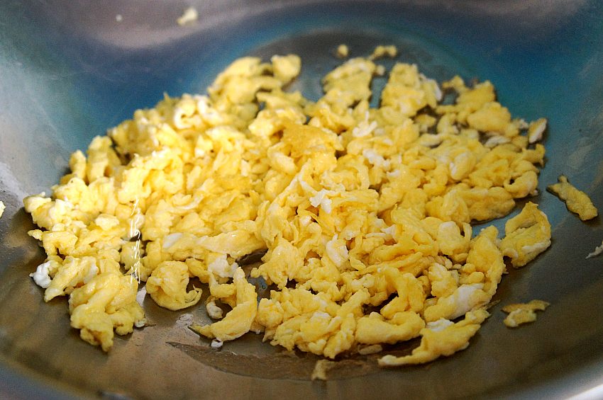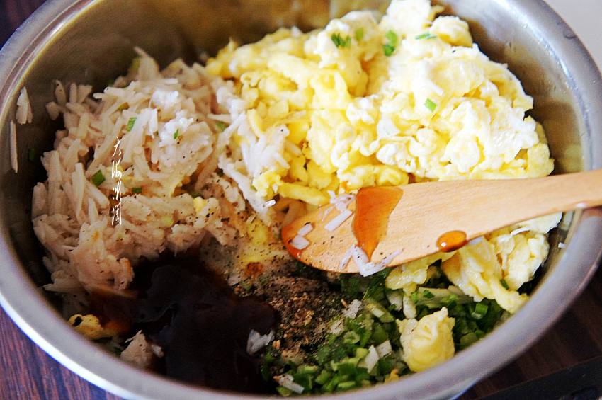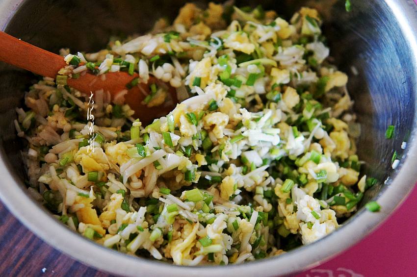3、煎鸡蛋时略多加一点油,拌馅时不用另加油了。