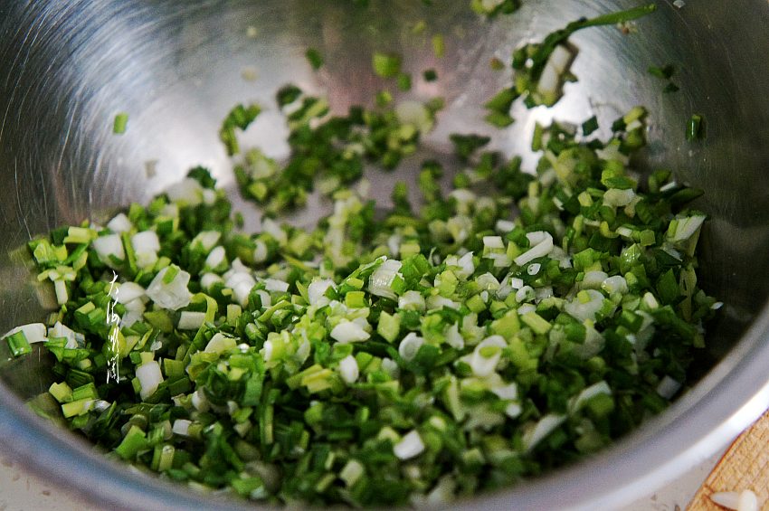 4、韭菜摘净在淡盐水中浸泡10分钟,反复清洗干净,控净水分,切碎。加入适量的色拉油拌匀,这一步很关键哦,一定要先做好再拌馅。