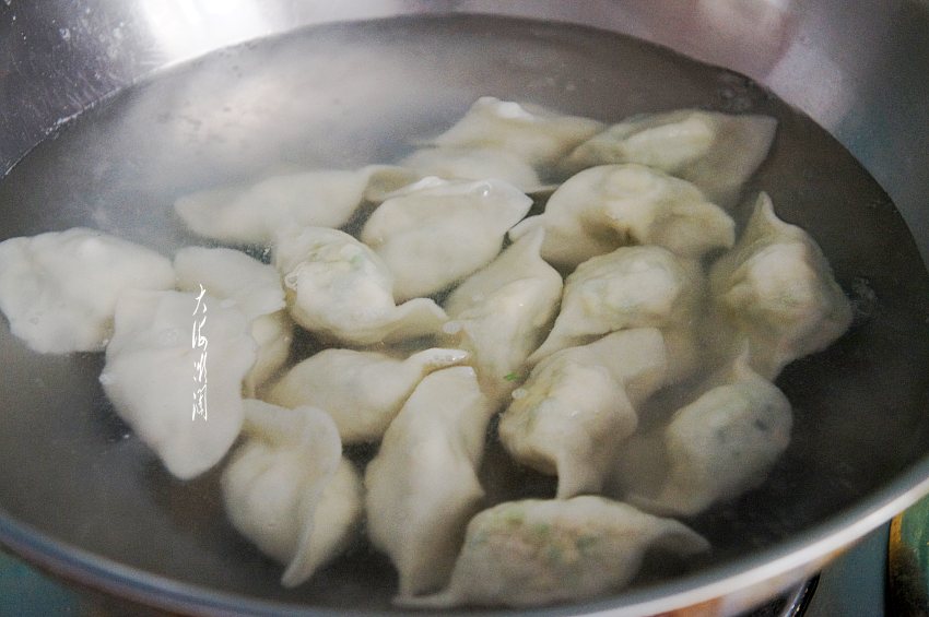 8、锅中加入适量的水,水开后下入饺子,注意别粘连,煮开浇冷水,再煮开再浇冷水,第三次煮开即可捞出,饺子煮的恰到好处。
