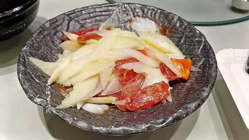 【辣味小炒】以为是腊肉小炒,其实是腊肠炒酸黄瓜,味道不错,北方很少有腊肉菜,腊味肠也是南方食材,口感有点甜,蛮受欢迎的一道小炒。