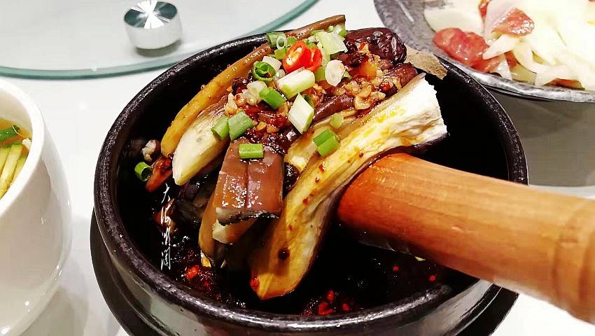 【欠揍的茄子】这名字挺有意思的,也挺形象的,瓦罐装满茄子,放上调味料,然后用木杵子把茄子杵碎,谓之欠揍。这样加工后即入味又好吃,重要的是你要自己亲手操作,这种感觉很好,这种吃法感觉还是小时的吃法,这道茄子老人们很回味,年轻人很新鲜,这大概就是卖点了。