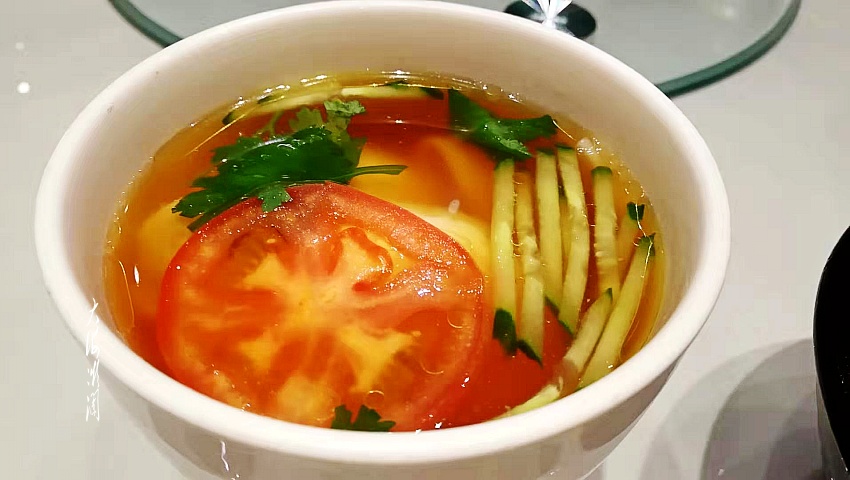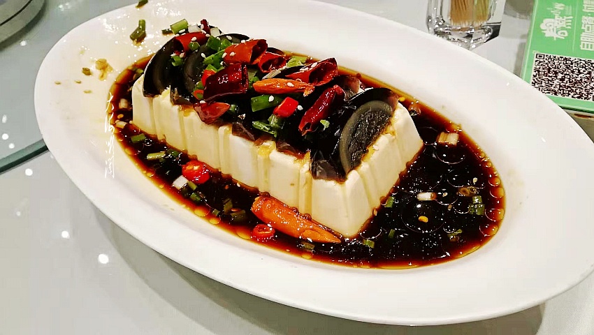 【皮蛋豆花】松花蛋与豆腐的搭配,特别适合老人吃的一道菜,豆腐口感鲜嫩,滑滑的,味道鲜美,上边码上松花蛋,别有风味。