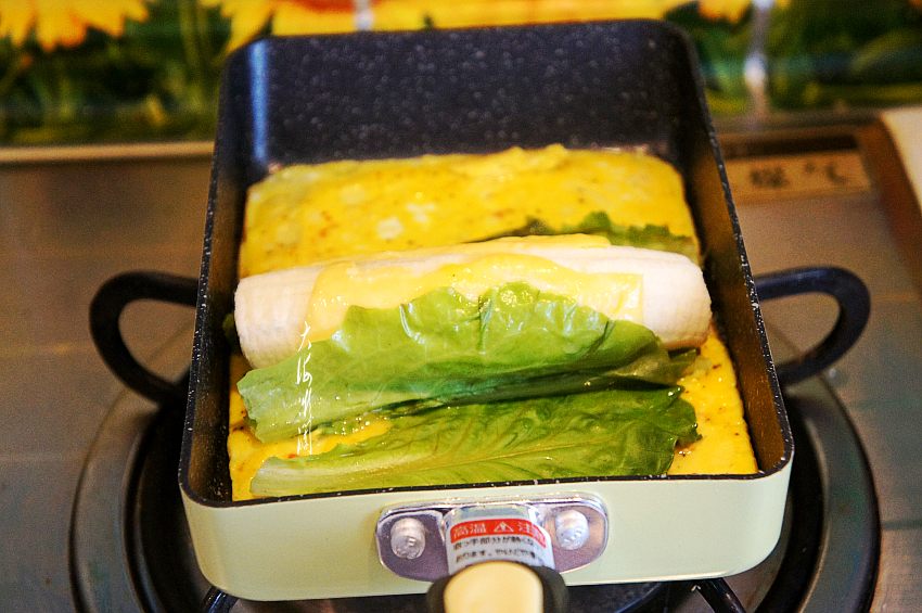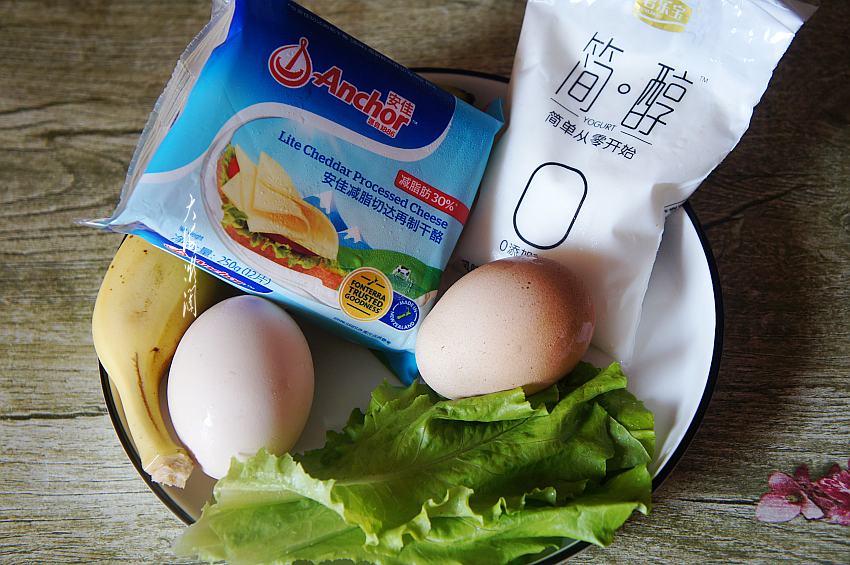 【玉子烧】所需食材:鸡蛋2个;牛奶15g;烤肠半根;奶酪1片;香蕉1根;生菜叶适量;胡椒粉适量。