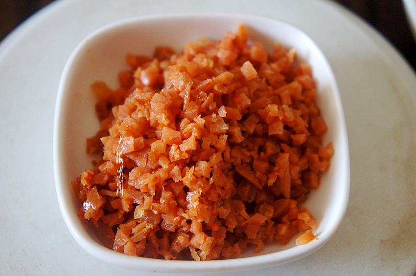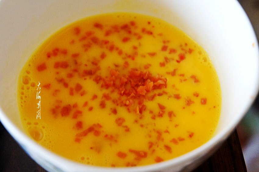 2、烤肠切碎,烤肠有咸淡味,所以蛋液我没加盐。