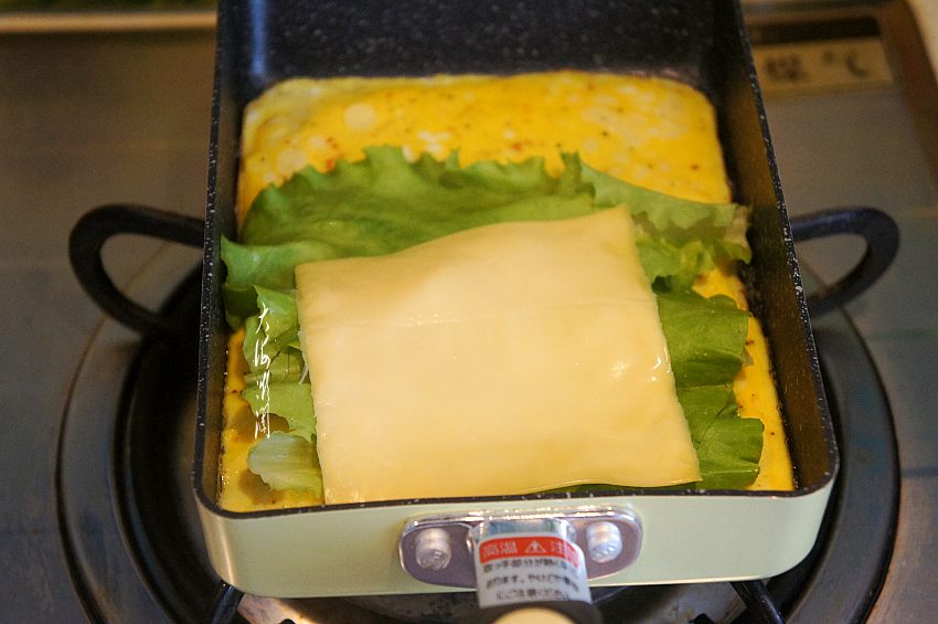 5、在蛋液快熟之前,放上几片生菜叶,放上一片