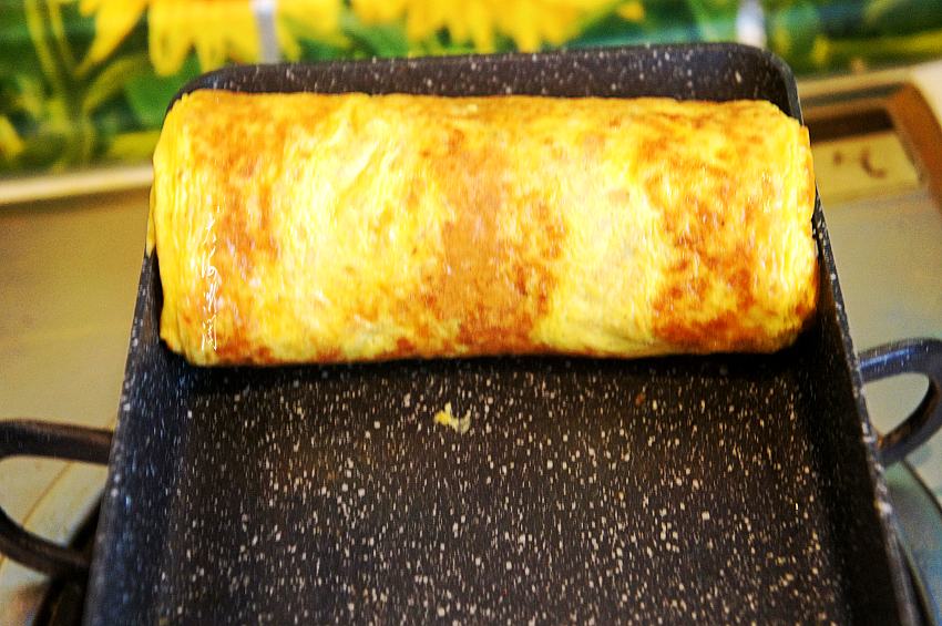 8、重复前边的步骤,煎第二片蛋饼,在蛋液快熟之前,放上之前的蛋卷,用筷子和铲子协作卷起来,稍微放一下定型。