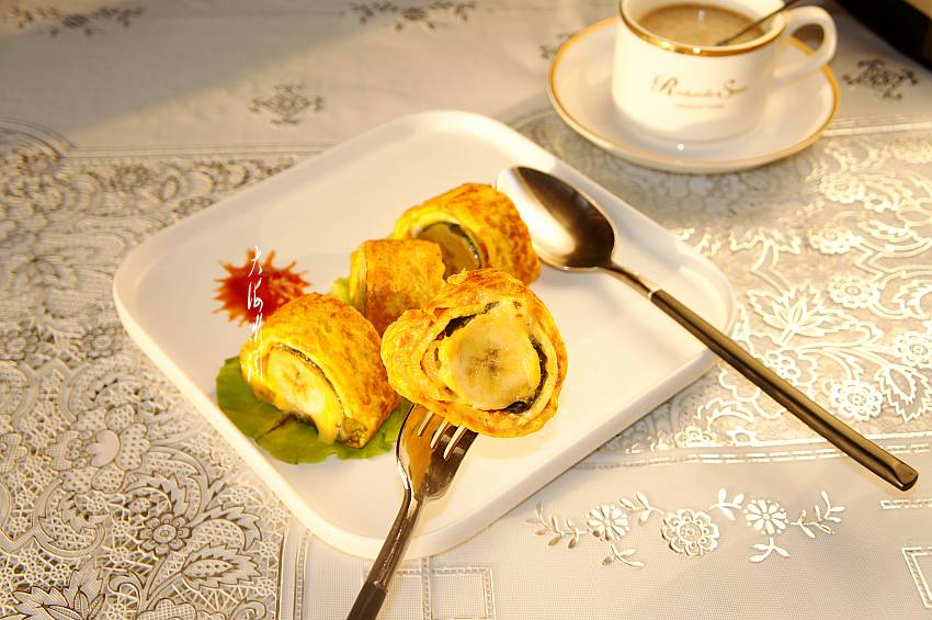 7、这个蛋卷比较粗大,我把他取出来,煎另外一片蛋饼,如果不用香蕉,蛋卷很小,就这样放在边上,再煎下一个蛋饼。