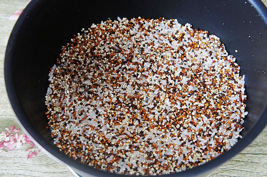 4、大米反复淘洗干净,电饭煲内胆甄锅中,然后加入浸泡好的藜麦,搅拌均匀。