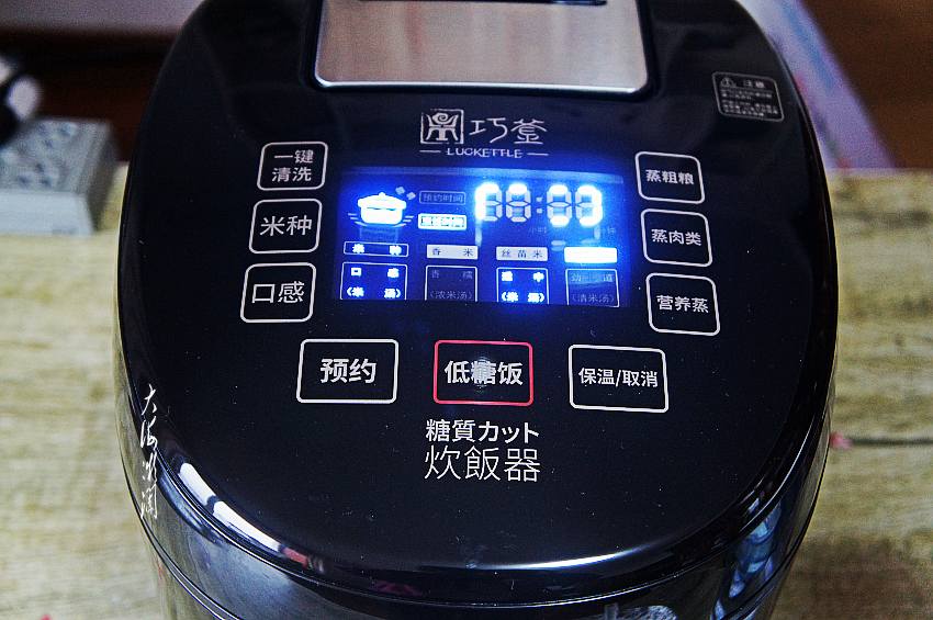 7、盖上锅盖,听到卡“咔”的一声说明锅盖关好,按下“低糖饭”即可,电饭煲开始蒸饭,蒸制过程中,能听到多次冲水的声音。