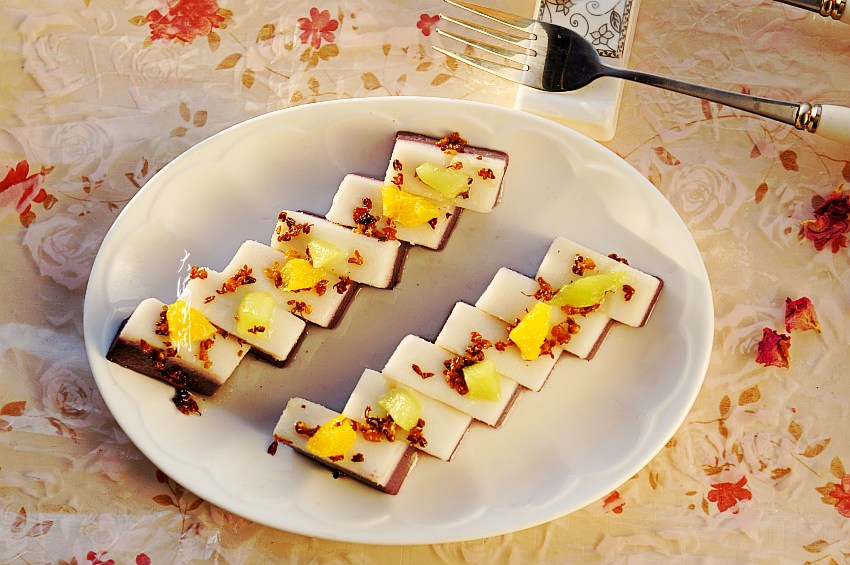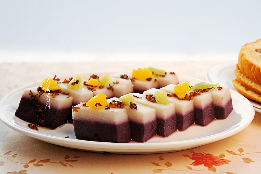 【紫薯山药桂花糕】所需食材:紫薯250g;山药150g;牛奶150g;椰奶100g;红糖30g;白糖20g;鱼胶片2.5片;糖浆汁适量;桂花糖适量。