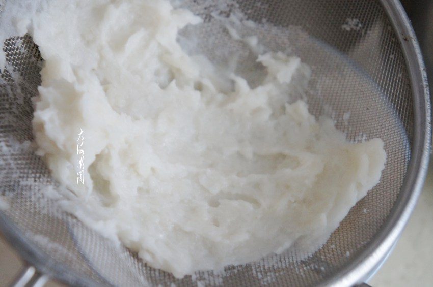 4、蒸熟的山药温热时装在食品袋内,用擀面杖擀碎成泥,同样要过筛。