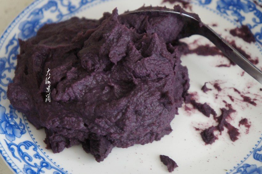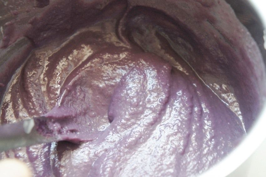 2、蒸熟的紫薯温热时装在食品袋内,用擀面杖擀碎成泥,过筛,过筛后紫薯泥更细腻。