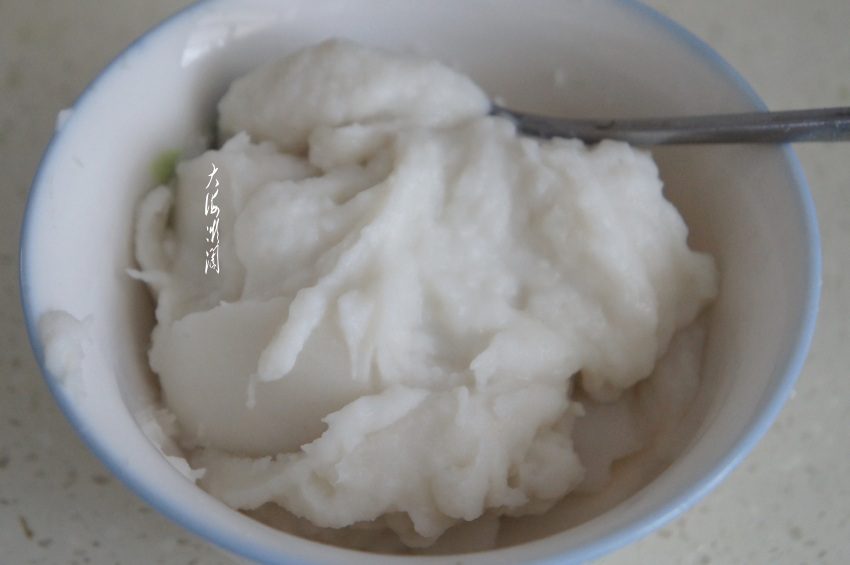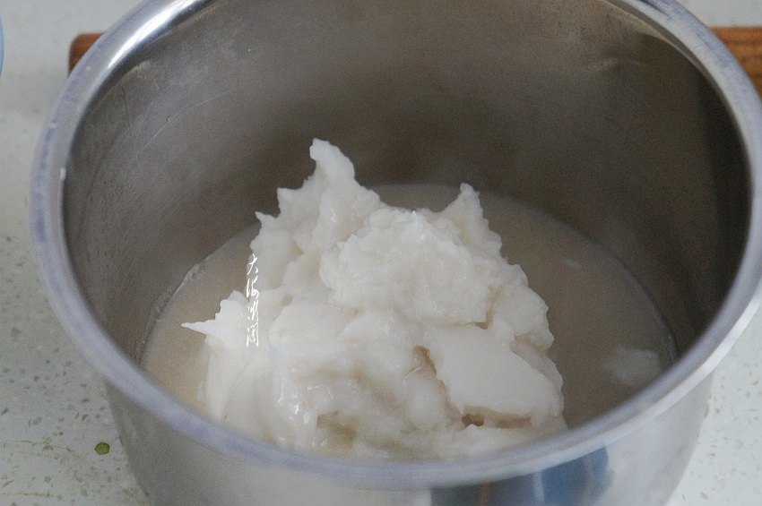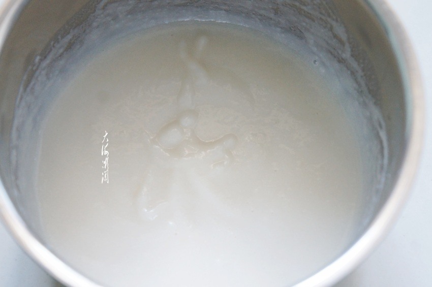 9、同样的方法熬制100g椰汁,加入1片鱼胶片,熬至完全融化,倒入山药泥中。