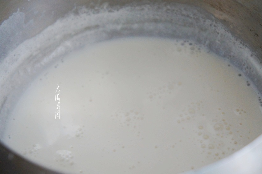 6、奶锅加入150g牛奶烧开,加入1.5片鱼胶片,轻轻搅拌,直至完全融化。