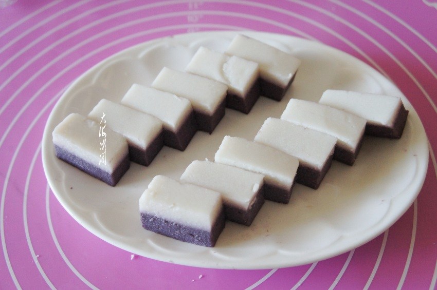 11、取出已经凝固的紫薯模具,将调理好的山药泥倒入装有紫薯泥模具的上边,自然凝固。