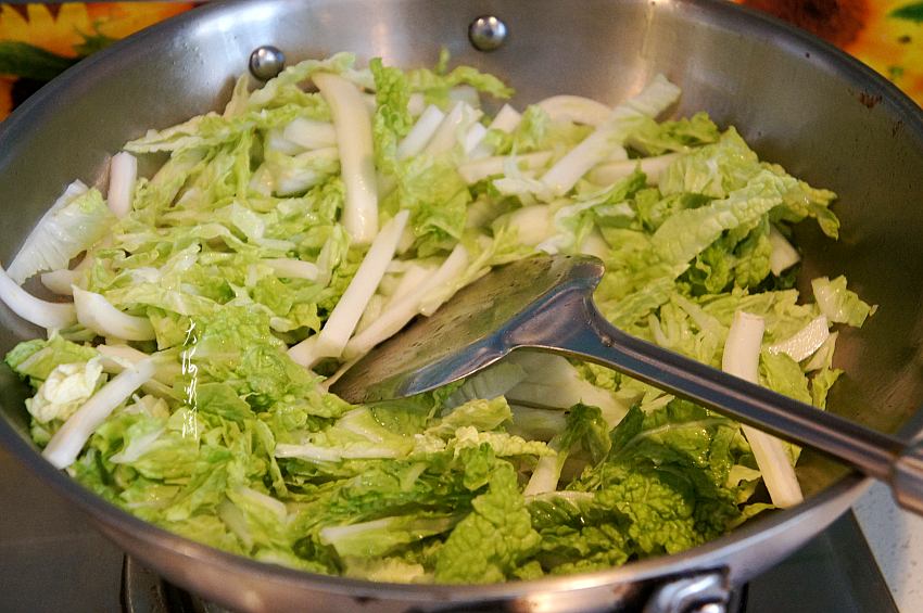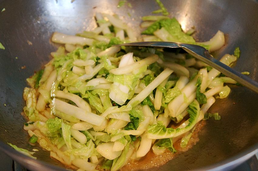 5、炒至白菜条变软,没有水分为好,这样炖出来的白菜没有白菜水的味道。