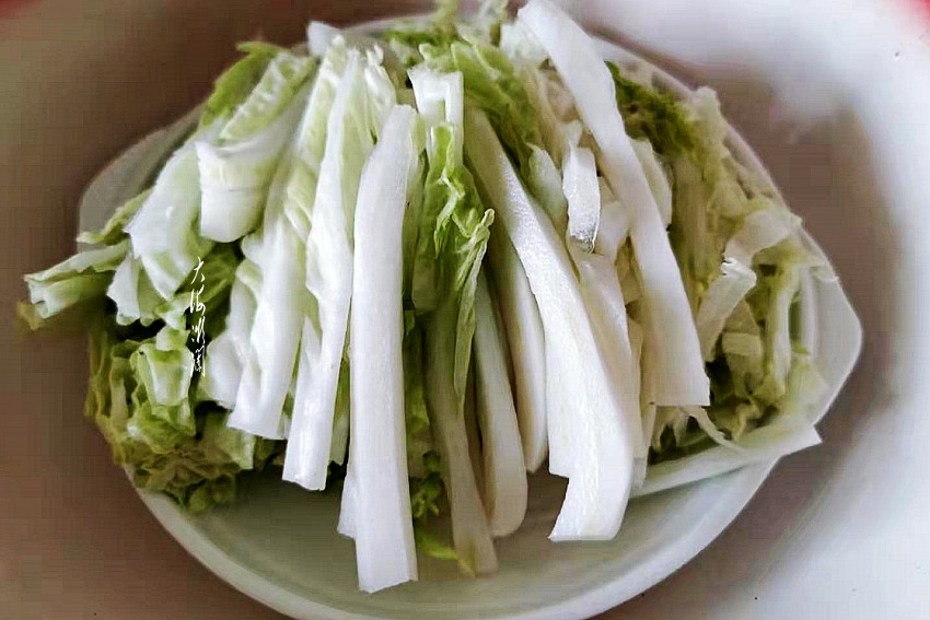 2、白菜顺切条,白菜条可以切得粗一点点,炖后口感好。白菜炖粉条,典型的东北农家菜,深受北方人的喜爱。