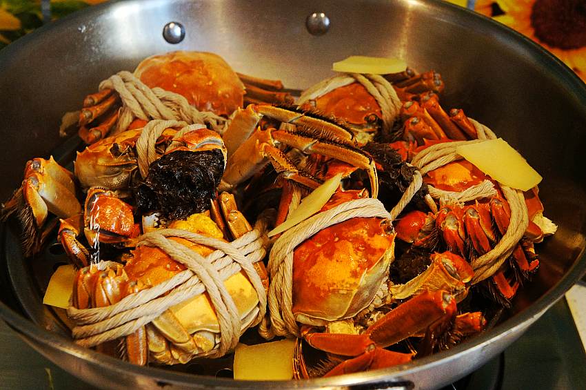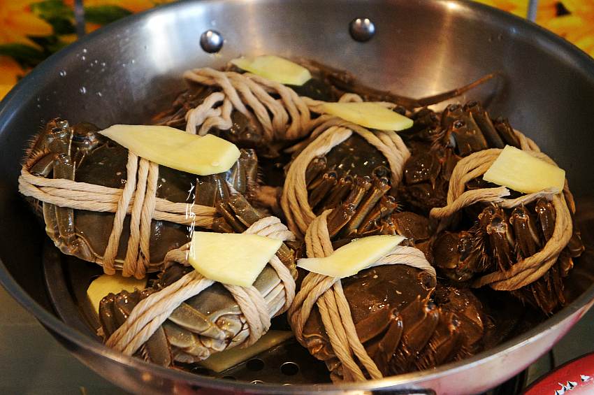 1、一定要捆绑大闸蟹后再上屉蒸之前,检查一下是否捆绑好,有松动的要系紧,避免掉腿。