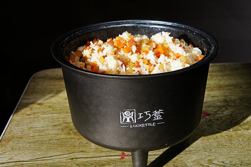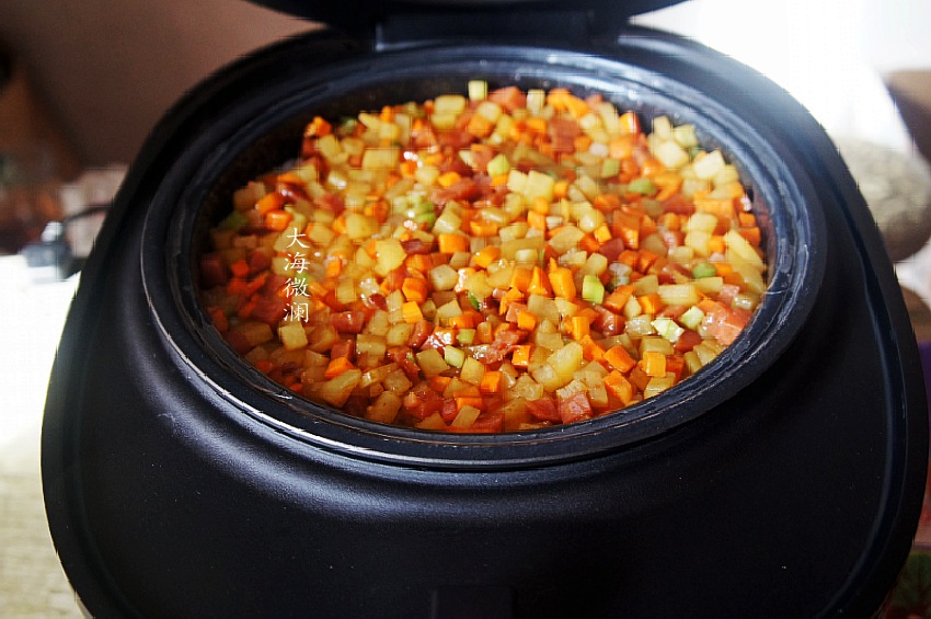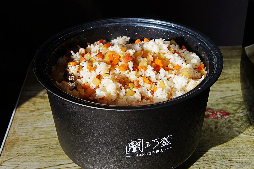 10、待巧釜脱糖电饭煲蒸制剩最后10分钟时,将刚刚炒好的食材放入电饭煲,合上上盖继续蒸。