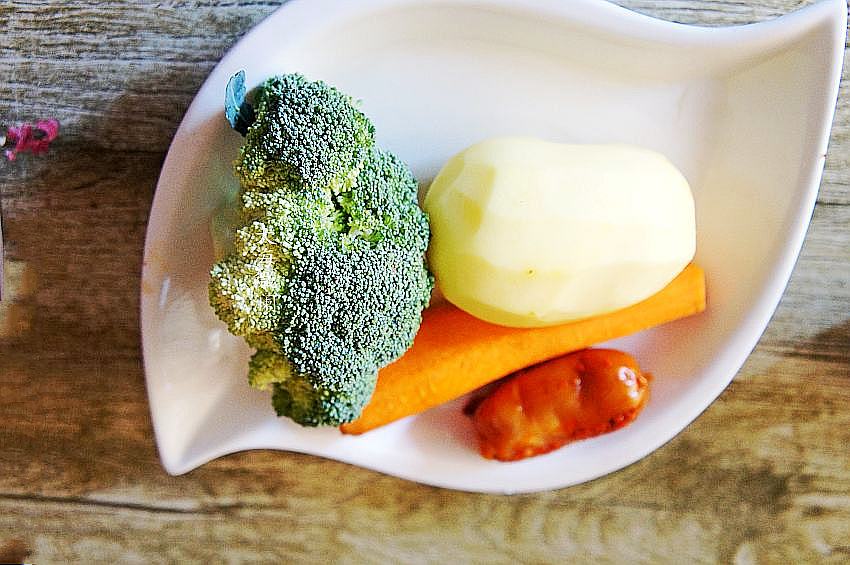 5、此时可以处理蔬菜,西兰花掰成小朵,淡盐水中浸泡10分钟以上,反复清洗干净。土豆去皮洗净,胡萝卜去皮洗净。