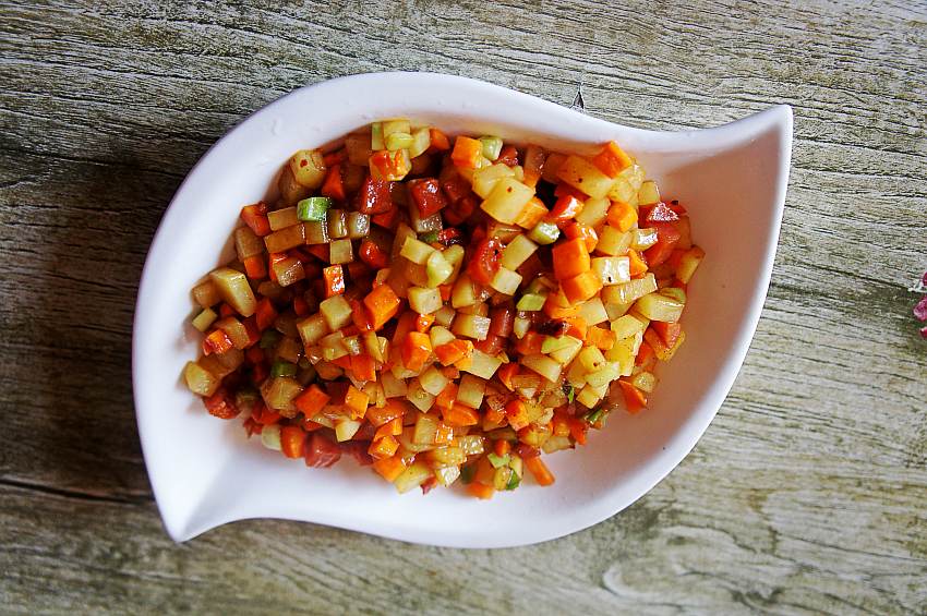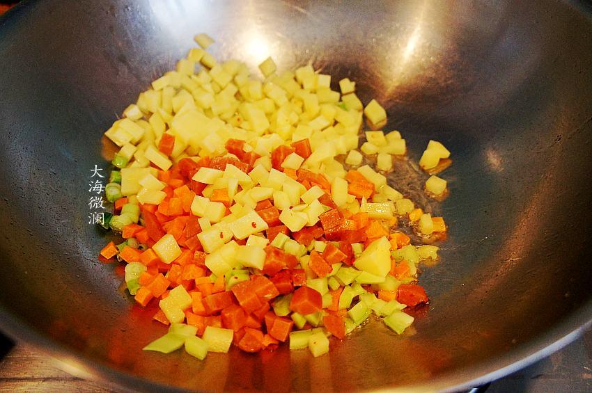 8、炒锅加入适量的油,爆香五香粉和葱花,加入胡萝卜丁、土豆丁和烤肠丁翻炒。