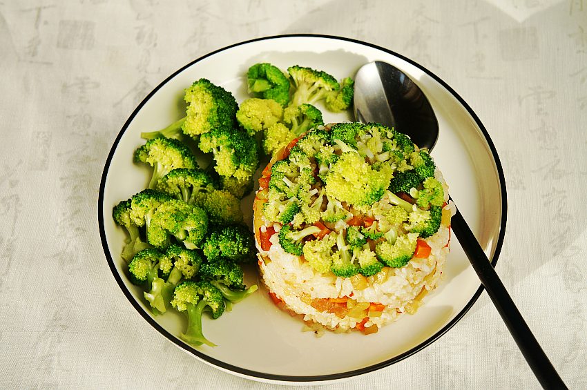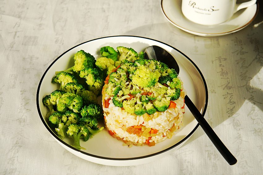 13、焯好的西兰花码盘,杂疏饭出锅,喜欢的可以调个酱汁拌西兰花,直接吃也不错,因为米饭有咸淡,直接吃更清淡爽口。