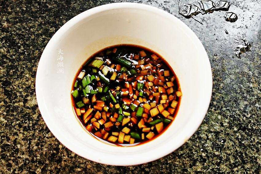 6、做个调味汁,葱去皮洗净切碎,姜去皮洗净切碎,加入适量的糖、醋、海鲜酱油调味,也可以和大闸蟹一起蒸,还可以炸点油浇上,总之,这个蘸汁可以随自己喜欢的口味调整。