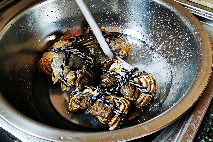 2、冷水冲洗,我在家要用牙刷从头刷到脚,老板娘说太湖的大闸蟹很干净,水冲一下就好了。