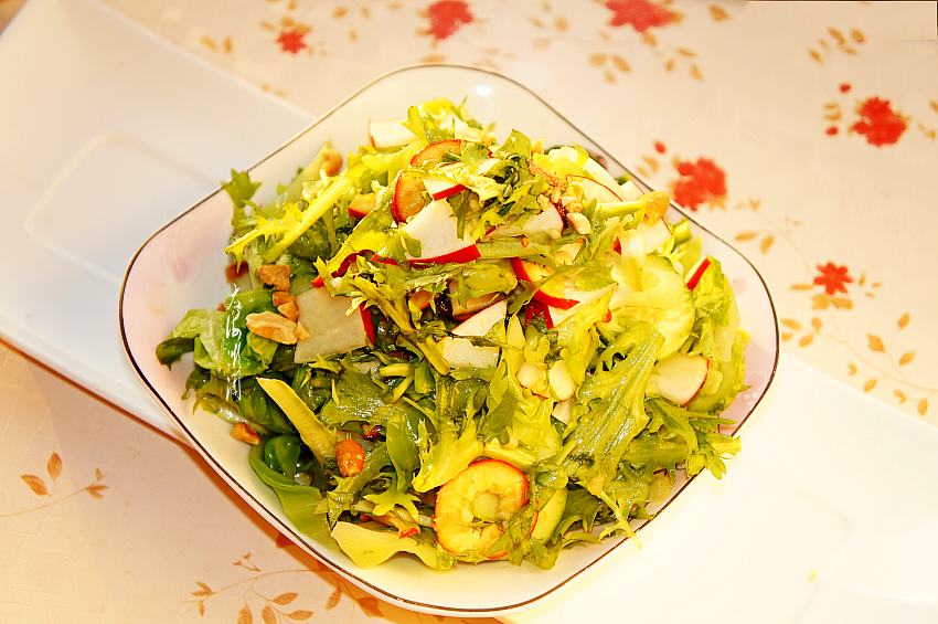 秋天气候干燥,容易让人没有食欲,不妨亲自动手来做一份凉拌菜吧。这道爽口菜,对食材没有特别要求,喜欢吃的都可以放进来,重要的是各种食材搭配要能勾起食欲,北方的晚秋蔬菜的色彩相对少了,最简单的紫甘蓝都没有买到,这道菜我用了苦菊、甘蓝菜、红萝卜、山楂和黄瓜,都是极普通家常菜,这一大盘成本不超过3元,饭店最少也要十几二十元吧,还是自己做物美价廉,而且干净,吃得放心。做法也非常简单,调一调拌一拌就可以了,嫩绿新鲜的各种蔬菜,各种滋味融合在一起,酸甜爽口,开胃下饭,喜欢辣味的加点油腐乳,那味道也是超级好吃,端上桌就抢光了,汤汁都不剩。