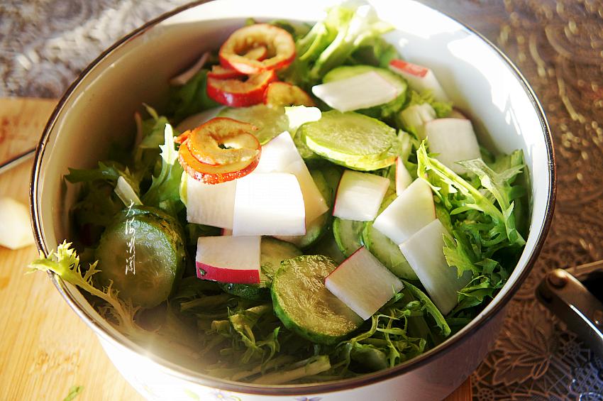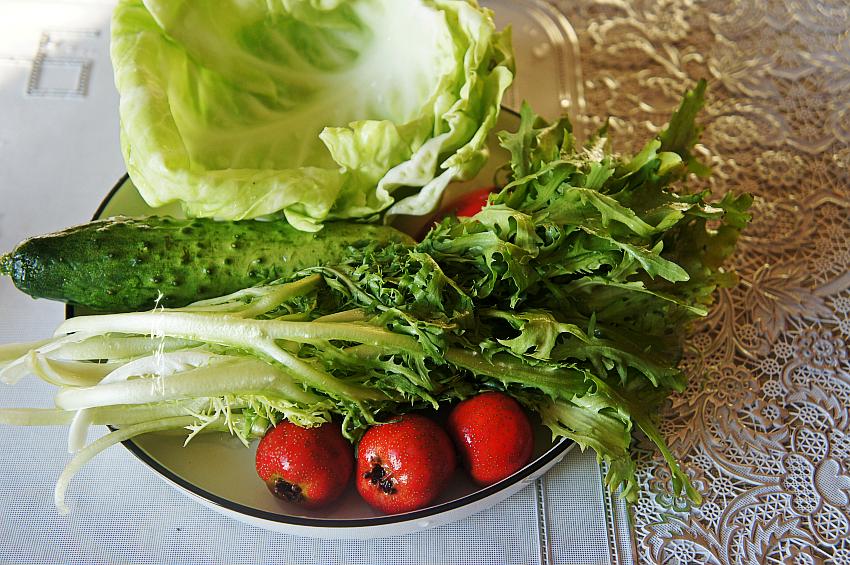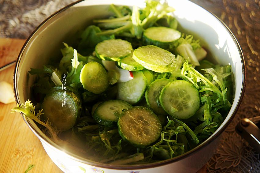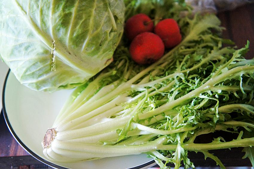 2、苦菊、甘蓝菜去掉老叶,将苦菊、甘蓝菜、黄瓜和山楂放进淡盐水盆中,浸泡10分钟以上,尽量去除农药残留。或者用专用蔬菜清洗剂清洗干净。