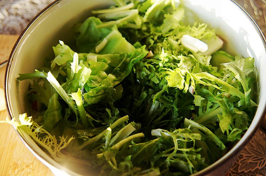 4、取大盆,将苦菊和甘蓝菜切段切块,放入盆中。